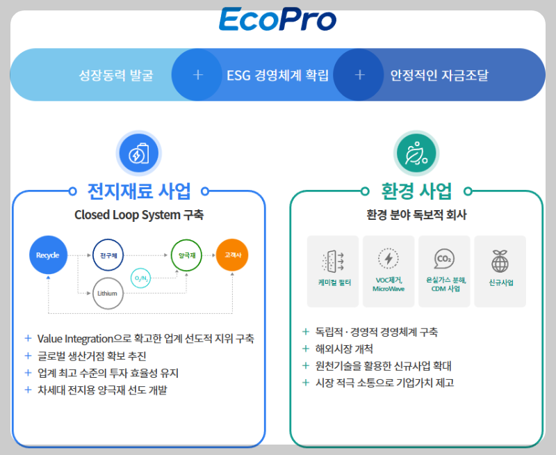 에코프로는 1998년도에 국내에 설립이 되었습니다. 대기오염 제어 관련 친환경 핵심소재 및 부품 개발에 주력해 왔던 회사이며 2003년부터 자국보다 수입 의존도가 높은 이차전지 핵심 소재들의 단계별 국산화에 성공해 "환경"과 "에너지"를 양대축으로 성장한 회사입니다. 2016년 5월 양극소재 사업 전문화를 위해 에코프로비엠을 물적분할한 에코프로는 2021년 5월 대기환경사업의 전문화를 통해 에코프로에이치엔을 인적분할하고 지주회사로 전환하였습니다.