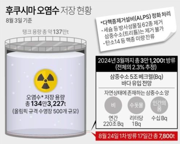한국, 대만, 중국 등의 주변국 모두 반대를 하고 있지만 2023년 8월 24일 200~210t을 방출 하였습니다. 2024년 3월까지 보관된 오염수의 2.3%를 방류할 계획이라고 발표했습니다. 오염수를 바닷물과 희석하여 약 1km 길이의 해저터널을 통해 원전 앞바다에 방출했습니다.