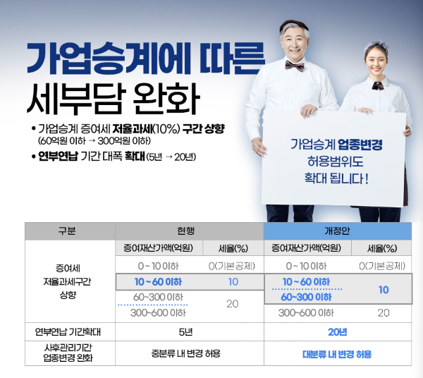 | ※ 가업승계 증여세 과세 특례 1. (대상) 18세 이상 거주자가 60세 이상 부모로부터 가업승계목적 주식등 증여 2. (특례한도) - 업력 10년 이상 : 300억원 , 업력 20년 이상 : 400억원, 업력 30년이상 : 600억원 3. (기본공제) 10억원 4. (세율) 10% - 단, 60억원 초과분은 20% 5. (사후관리) 5년 - 표준산업분류상 중분류 내 업종변경 허용 6. (연부연납 기간) 5년 7. (신청 기간) 증여받은 날이 속하는 달의 말일부터 3개월 이내 |