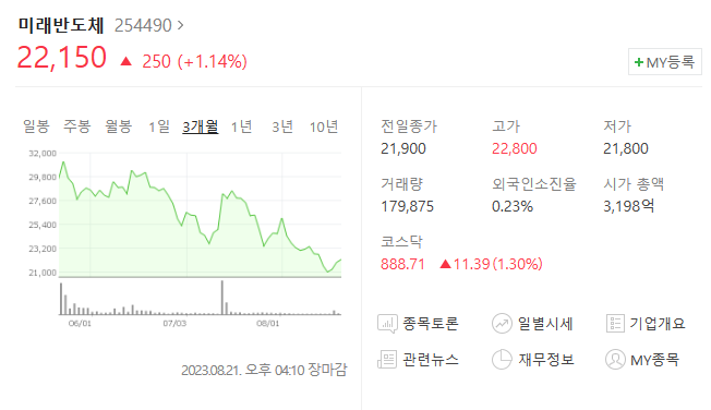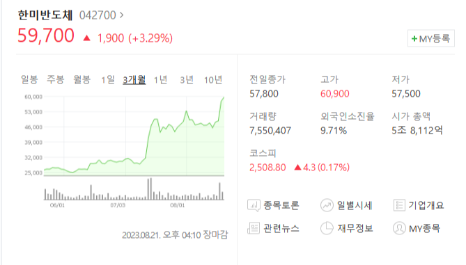2. 미래반도체 - 반도체 후공정장비를 제조하는 기업이며, 삼성전자와 SK하이닉스 등 대형 반도체 기업들과 협력하고 있습니다. AI돌풍과 함께 HBM주문둥이 쇄도되고 있는 상황에서 수요 증가에 따른 성장이 기대되고 있습니다. 또한, 주가도 함께 상승세를 보이고 있어 투자자들이 관심을 보이고 있습니다.